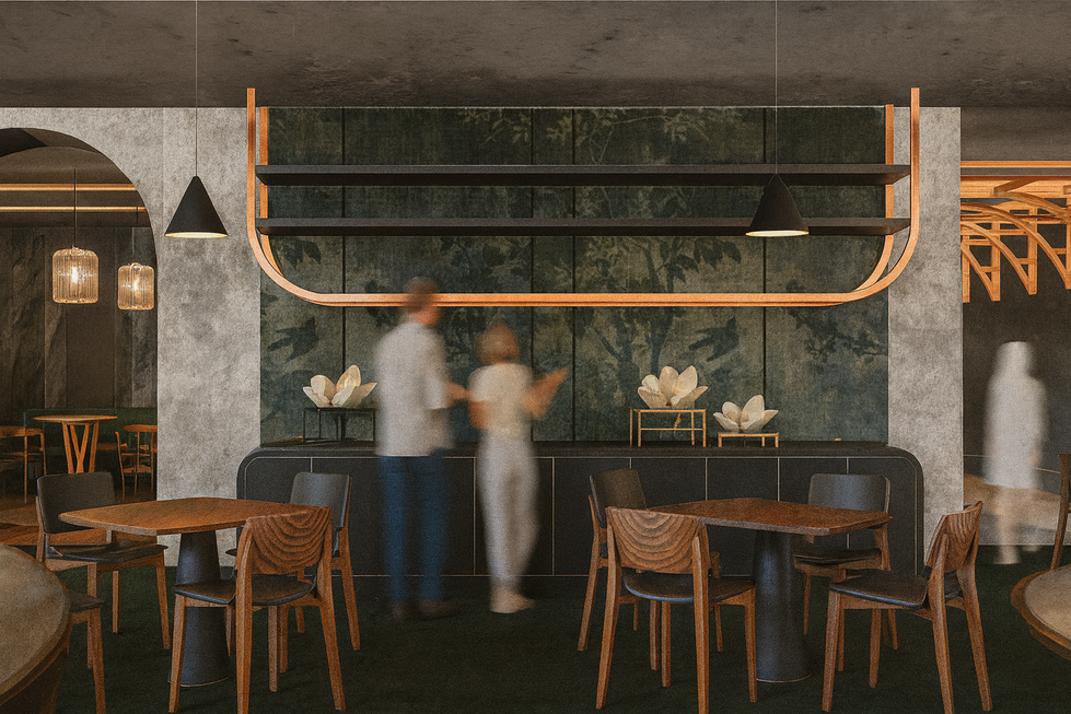 This restaurant design explores the narrative of Potsdamer Platz’s transformation from post-war devastation to a thriving cultural hub through the concept of “contrast.” The design juxtaposes past and present using robust materials like black marble, raw concrete, and copper finishes, alongside subtle Asian wallpapers and modern lighting. Spatial zoning divides areas such as bar, buffet, and dining into distinct yet cohesive experiences. The interior style is a contemporary fusion, merging industrial strength with heritage motifs to express unity, pride, and resilience through design.